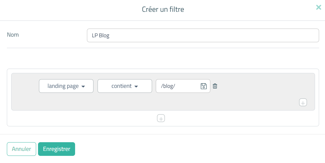 Ensuite, nous pouvons alors créer notre nouveau filtre, qui va contenir l'objectif préalablement ajouté à notre Suivi URL, comme ceci :