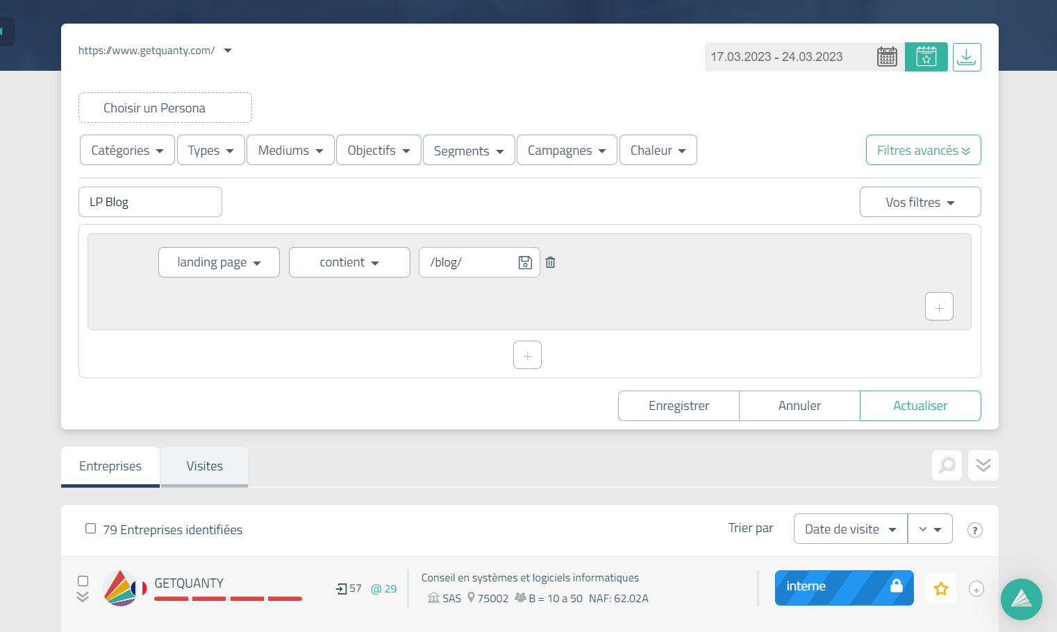 → Ce filtre va donc permettre de remonter toutes les entreprises dont la page d'atterrissage a été une page du blog.